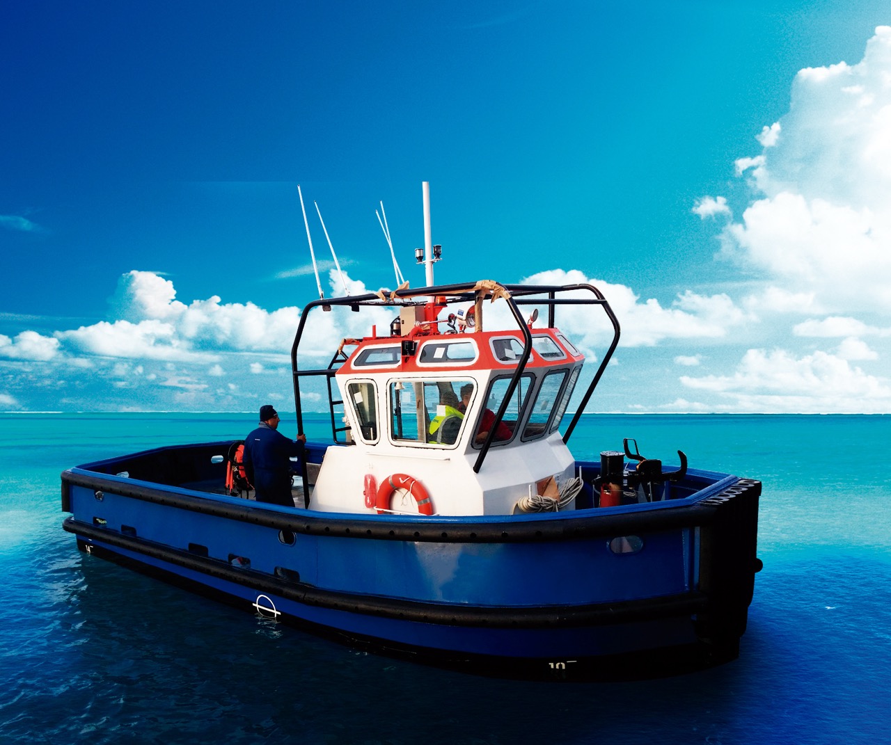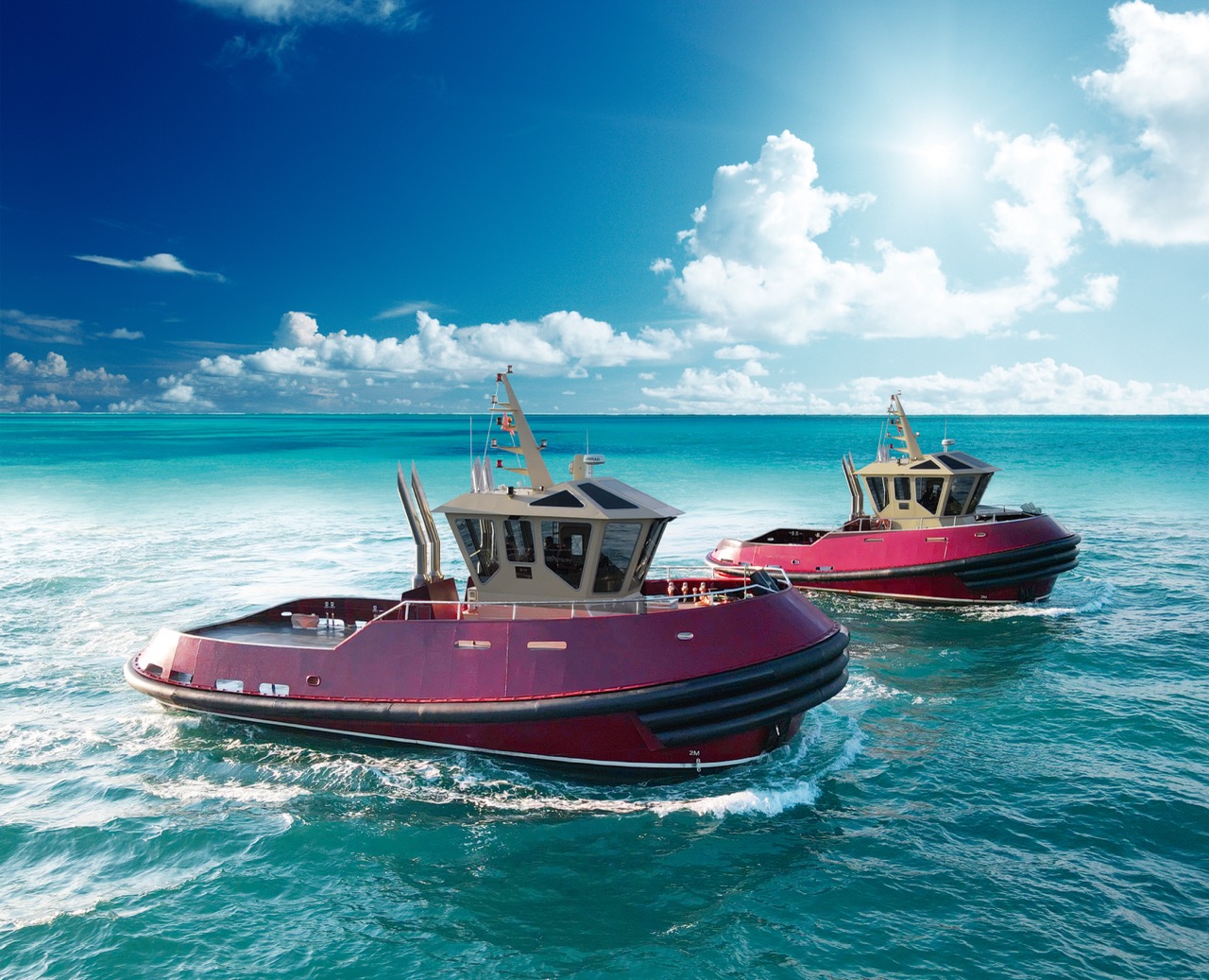 Custom tugboats for port operations and offshore support, delivering up to 70 t bollard pull. Available with diesel, hybrid or fully electric propulsion.